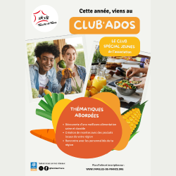 Caractéristiques : La famille de tous les adolescents de 13 à 17 ans des doit être adhérente à l’association locale du Club Ados. Les adolescents sont suivis dans la programmation de leurs activités par un responsable de l’association locale. Tous au long de l’année, les jeunes au sein de leur « club Ados » organisent, selon leurs idées, des activités et/ou des actions sur l’alimentation durable. Cependant, ils ont pour missions impératives de :