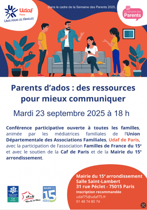 Mardi 23 septembre 2025, dans le cadre de la Semaine des parents (20-27 septembre 2025), la conférence intitulée « Parents d’ados : des ressources pour mieux communiquer », organisée en partenariat avec le service de médiation de l’UDAF 75, la CAF 75 et l’Association Familles de France Paris 15ème, a réuni une quinzaine de parents et grands-parents désireux de mieux comprendre et accompagner leurs adolescents.