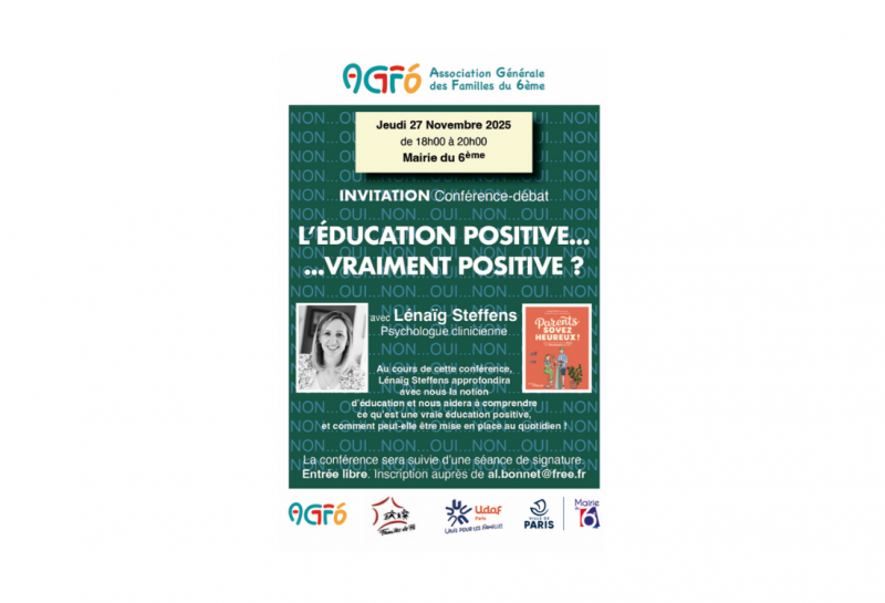 Familles de France met en lumière l’initiative de l’AGF6 – Familles du 6e Paris, qui organise jeudi 27 novembre de 18h à 20h à la Mairie du 6ème arrondissement, une conférence-débat sur l’éducation positive. Intitulée « L’éducation positive… vraiment positive ? », cette soirée propose un éclairage concret et accessible pour tous les parents et familles souhaitant améliorer leurs pratiques éducatives.